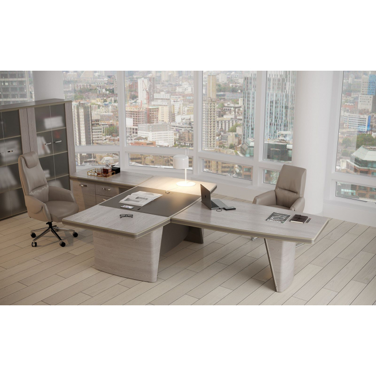 Характер кабинета руководителя «Нью.Тон» складывается из единства контрастов. Лаконичный современный стиль коллекции подчеркнут благородными материалами — древесными текстурами, кожей, стеклом и металлом. Округлые формы столешниц контрастируют с решительными скошенными линиями опор. Сдержанные природные оттенки поверхностей столов и тумб скрывают их технически совершенное наполнение. Тесное переплетение природного и технологичного, элегантность во всем облике и в каждой детали, воплощение будущего в настоящем — все это коллекция «Нью.Тон», которая дает вам увидеть то, что еще недавно вы не могли себе представить.
