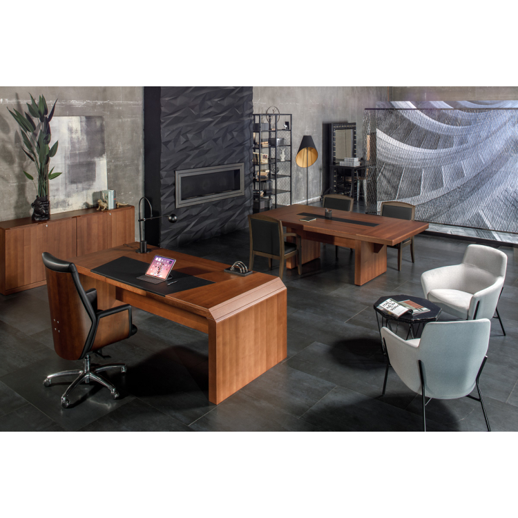 Выкладка столешниц письменных столов и столов для переговоров в цвете Дуб ферро - брашированный шпон. С помощью брашировки достигается эффект ярко-выраженной фактуры дерева.