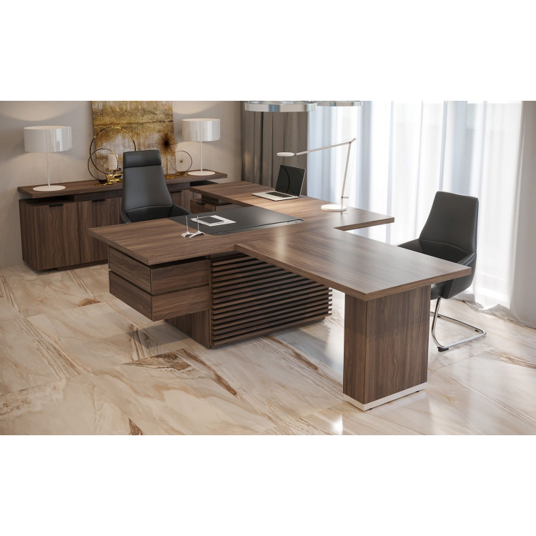 Кабинет руководителя «Time.S» впечатляет своей способностью к перевоплощению. Модельный ряд и цветовые решения коллекции продуманы так, что каждая комбинация создает уникальный образ, непохожий на другие. Основной элемент серии — стол руководителя с декоративным траверсом — задает стиль всего кабинета. Светлый цвет «дуб Эльза» в сочетании с матовым стеклом делает интерьер легким, а комбинация благородного «Палдао» с тонированным стеклом обеспечивает ощущение стабильности и надежности.