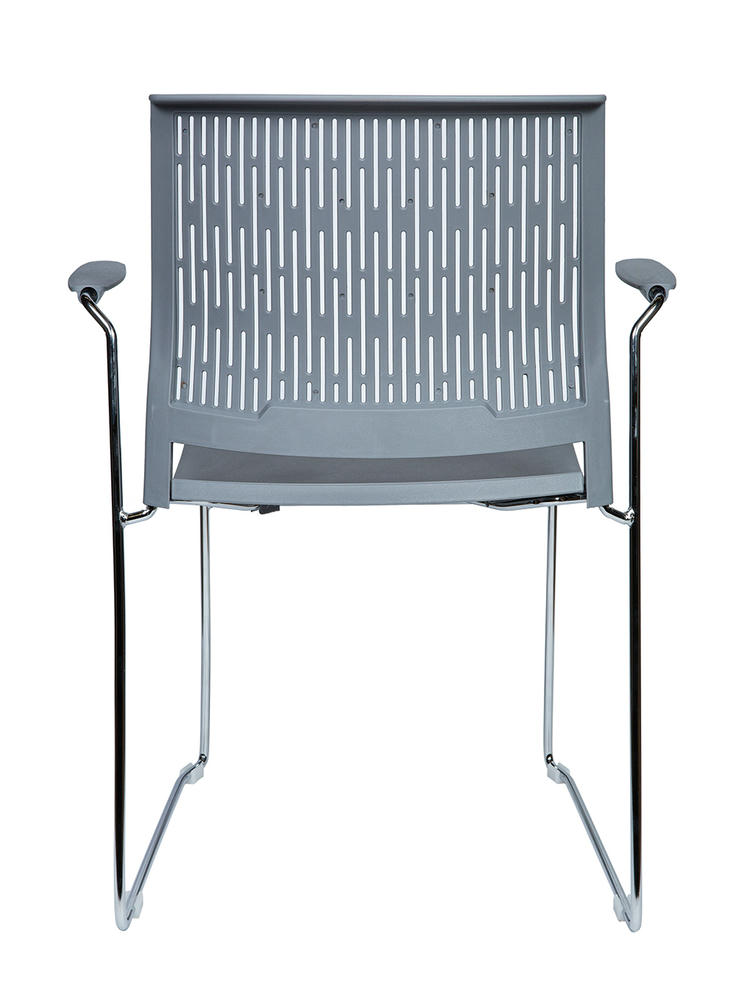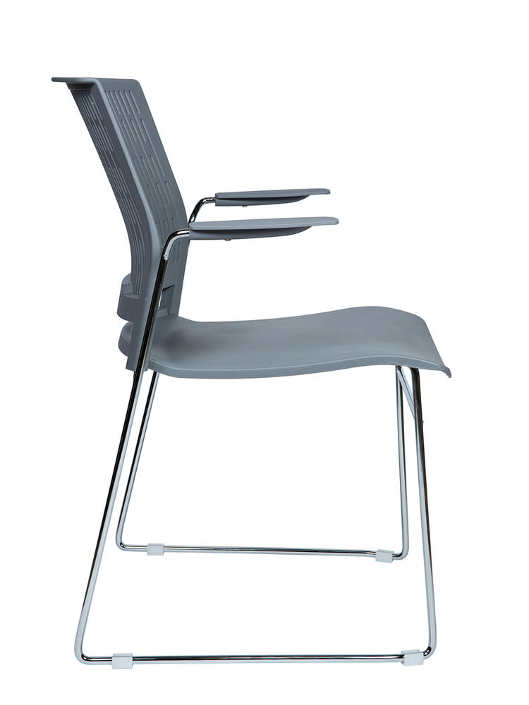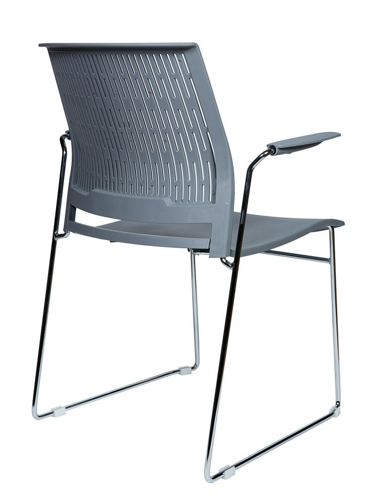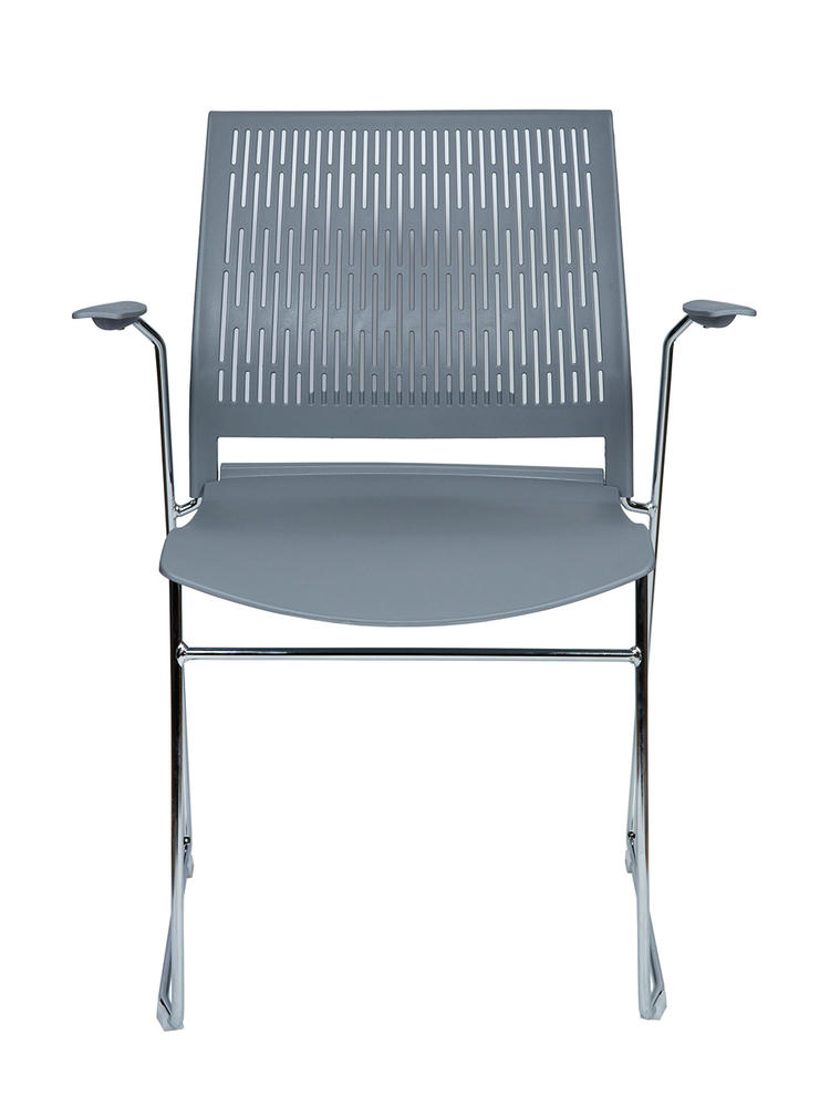 Современный офисный стул для учебных помещений и зон ожиданий. Пластик. Цвет серый. Основание металл, хром. Есть подлокотники. Стул выдерживает нагрузку до 90 кг. Гарантия год