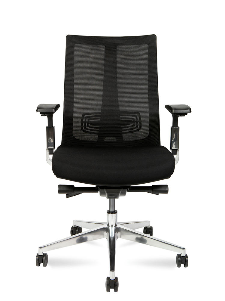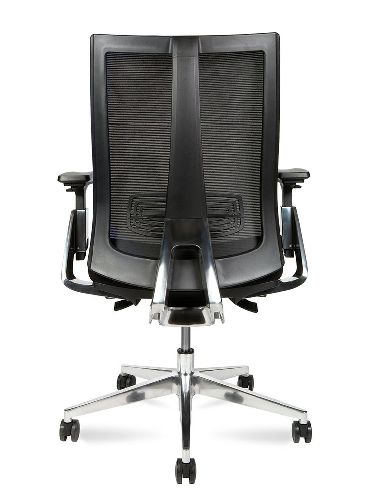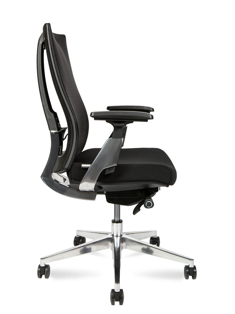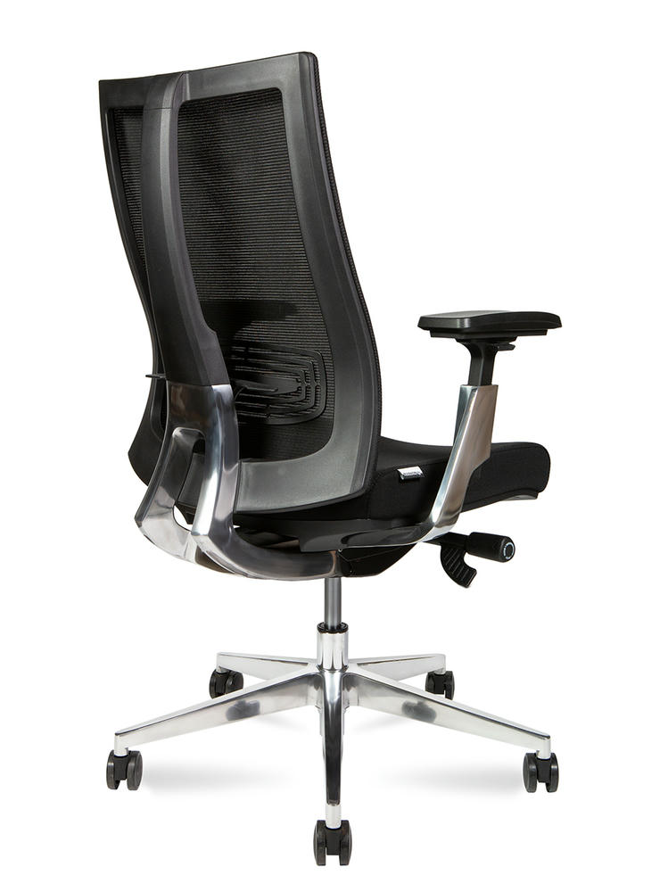 Эргономичное для руководителей First класса. Каркас спинки из усиленного нейлона с поясничной опорой, материал спинки - армированная сетка. Сиденье из высокопрочной ткани с наполнителем ФППУ. 3D подлокотники с алюминиевым каркасом можно отрегулировать по высоте, повернуть влево и вправо, двигать вперед и назад. Кресло оснащено механизмом качания с возможностью фиксации в 4-х положениях и слайдером. Регулировка кресла по высоте и жесткости качания. Крестовина из полированного алюминия с бесшумными колесами. Сертифицировано по стандарту Bifma. Максимальная нагрузка - 130 кг. Гарантия - 5 лет