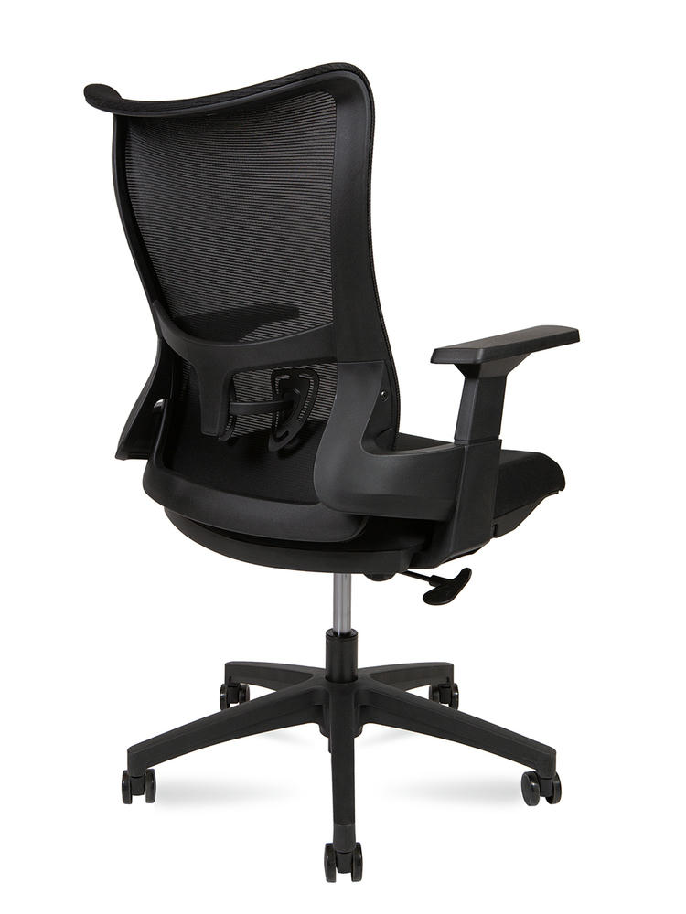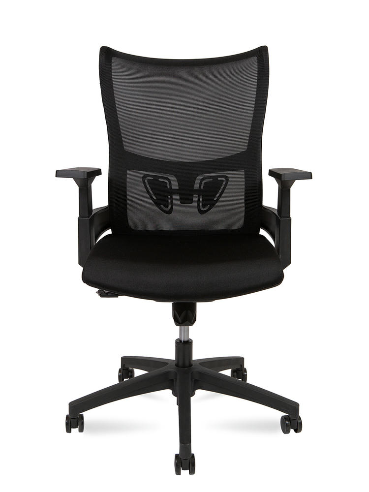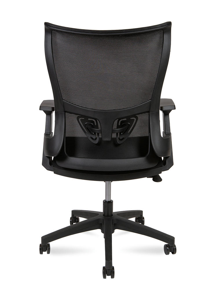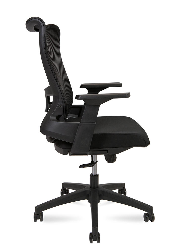 Эргономичное вращающееся кресло со средней спинкой. Сетчатая спинка рамка PU + регулируемая опора для поясницы Черный фиксированный подлокотник, Т-образный. Сиденье ткань , формованное PU + пластиковая отделка снизу Сертификат BIFMA, газлифт класса 3 механизм качания Топ ган База PU + PU ролики, бесшумный материал